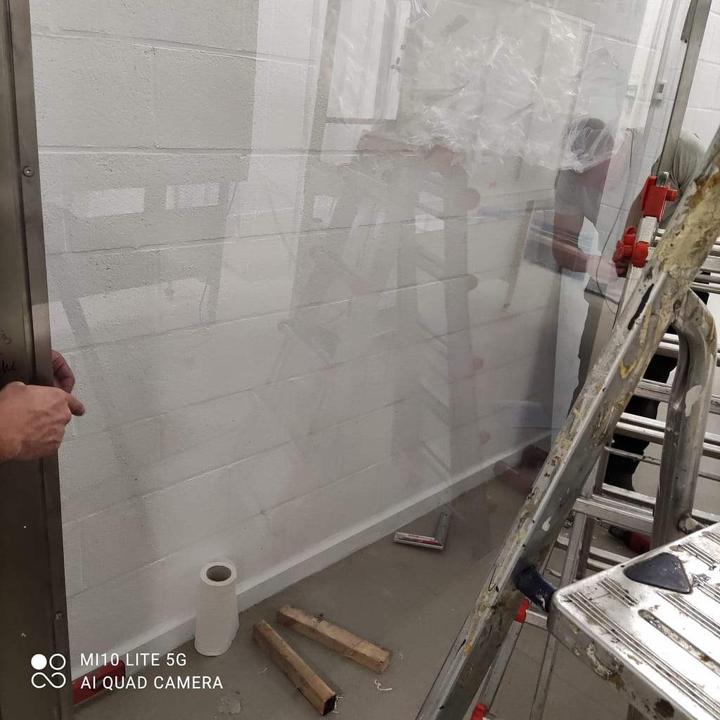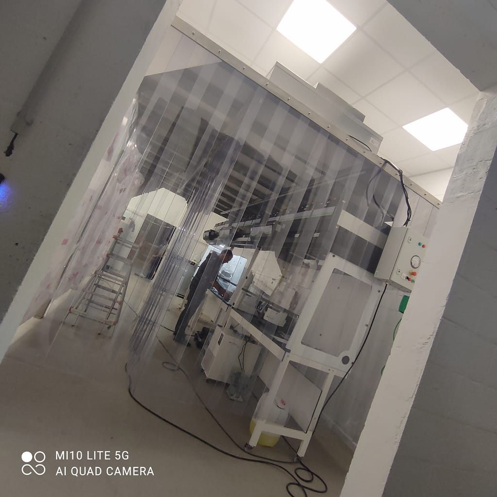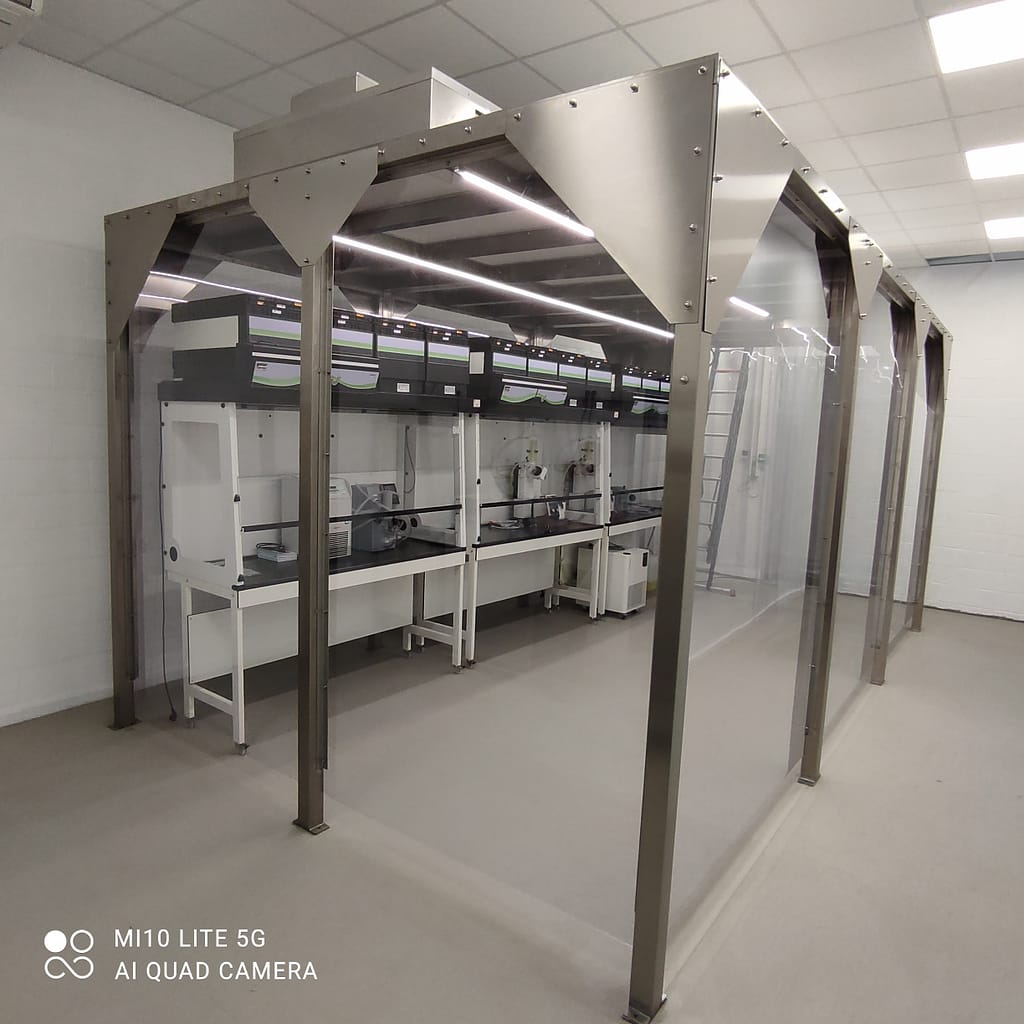 Dans le domaine des dispositifs médicaux, OPlusR propose des solutions innovantes, ici un cas concret d’une plafond soufflant monté sur des poteaux de 80 x 80 en inox et que l’on a placé des plaques transparentes en polycarbonate. L’air insufflé par le plafond soufflant balaye la cabine à flux en formant un air conforme à la norme ISO 14 644. Cet air est ensuite rejeté en dessous des plaques au travers de l’espace libre de 100 mm formé en dessous des plaques.