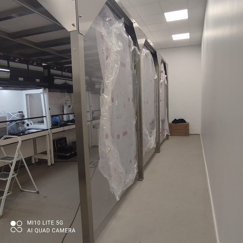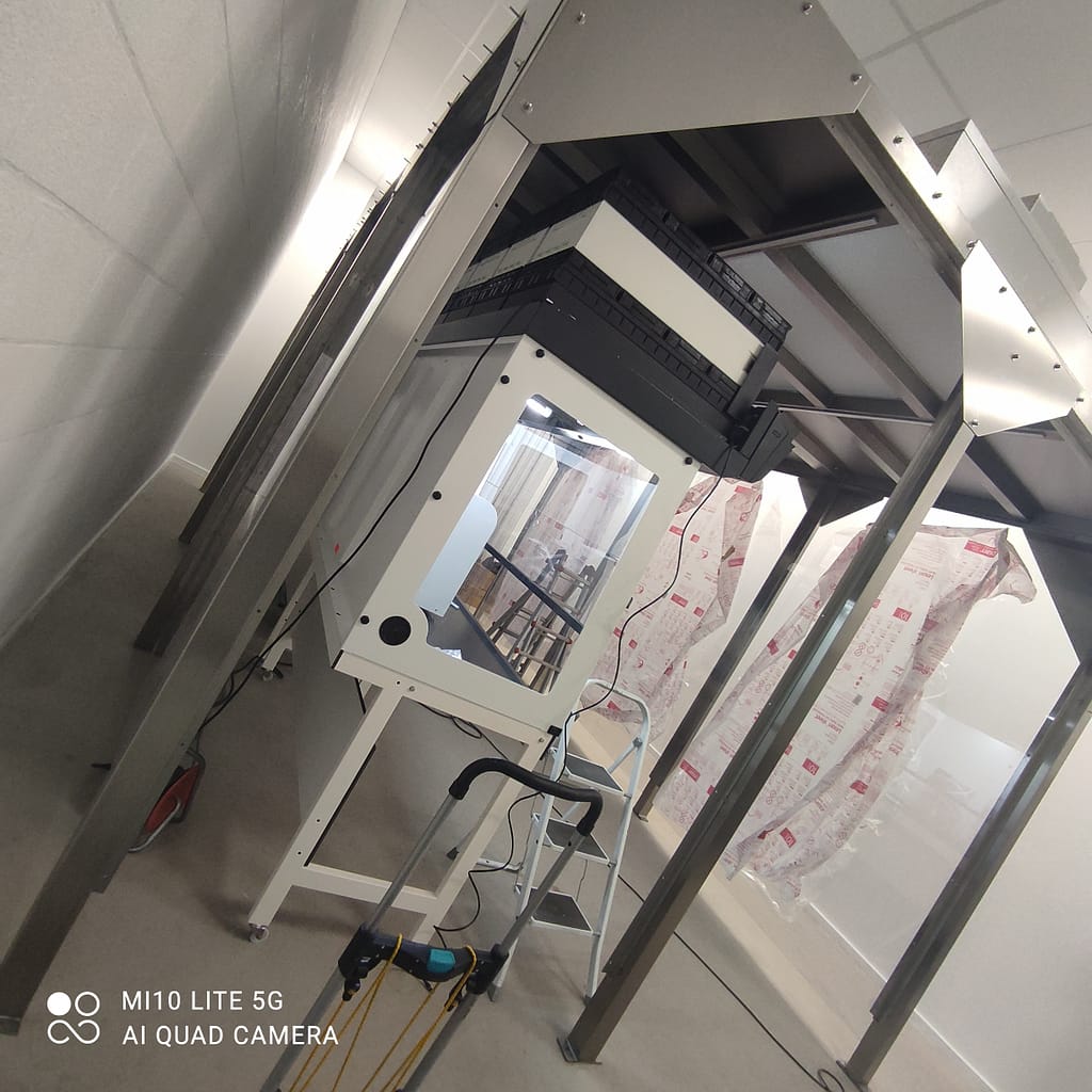 Pour la diffusion de l’air, notre choix s’est porté sur des FFU 150 watt moteur AC, montés au dessus du plafond de la cabine. Le client a ensuite installé 3 flux laminaire dans notre zone.