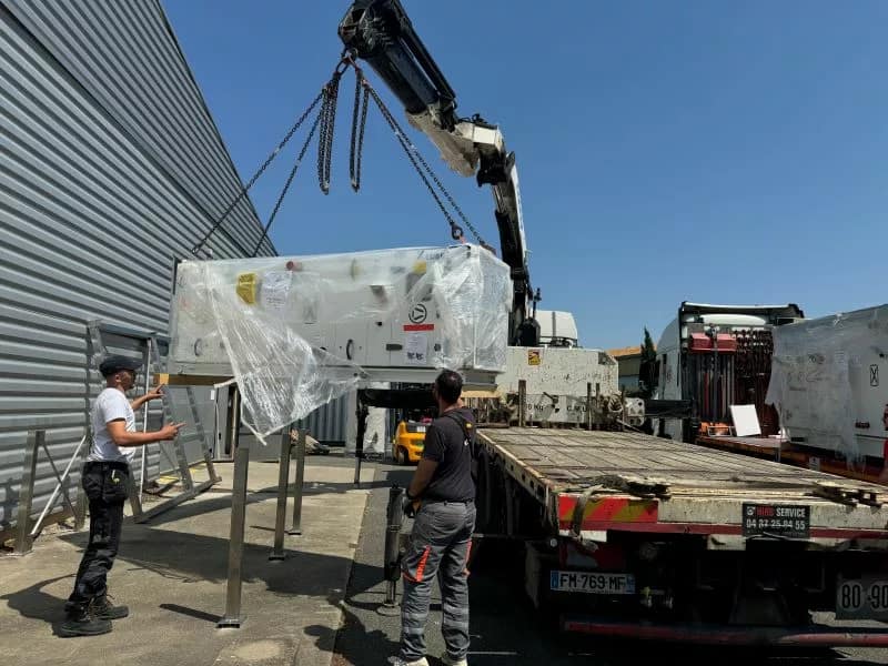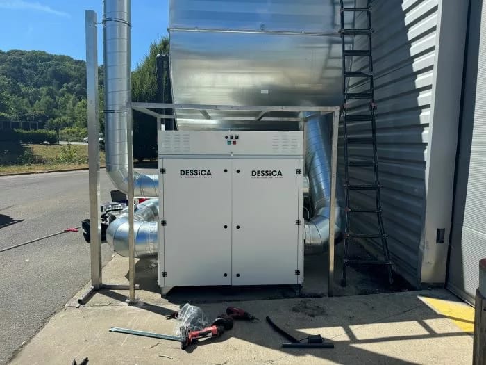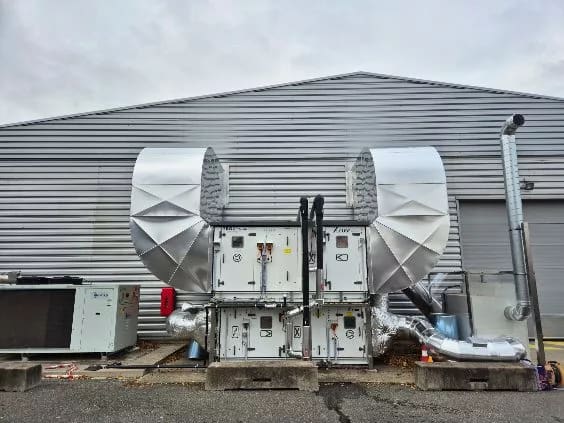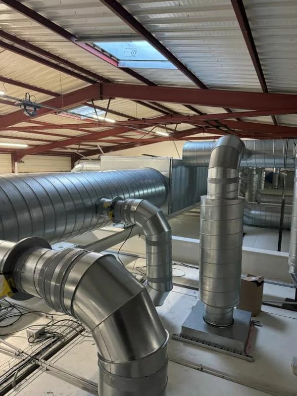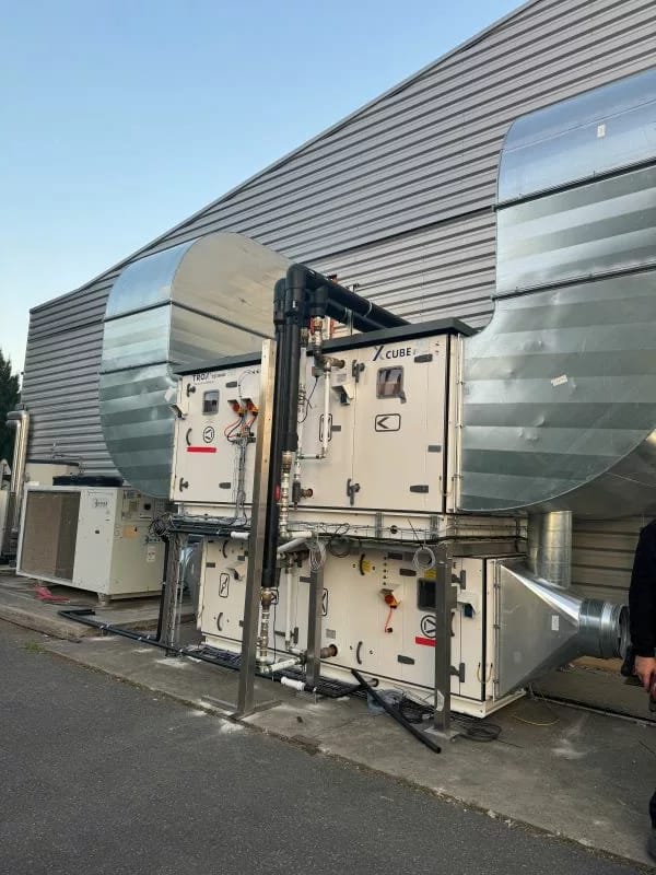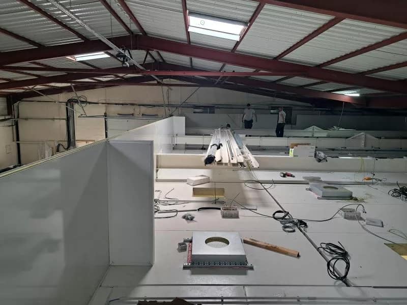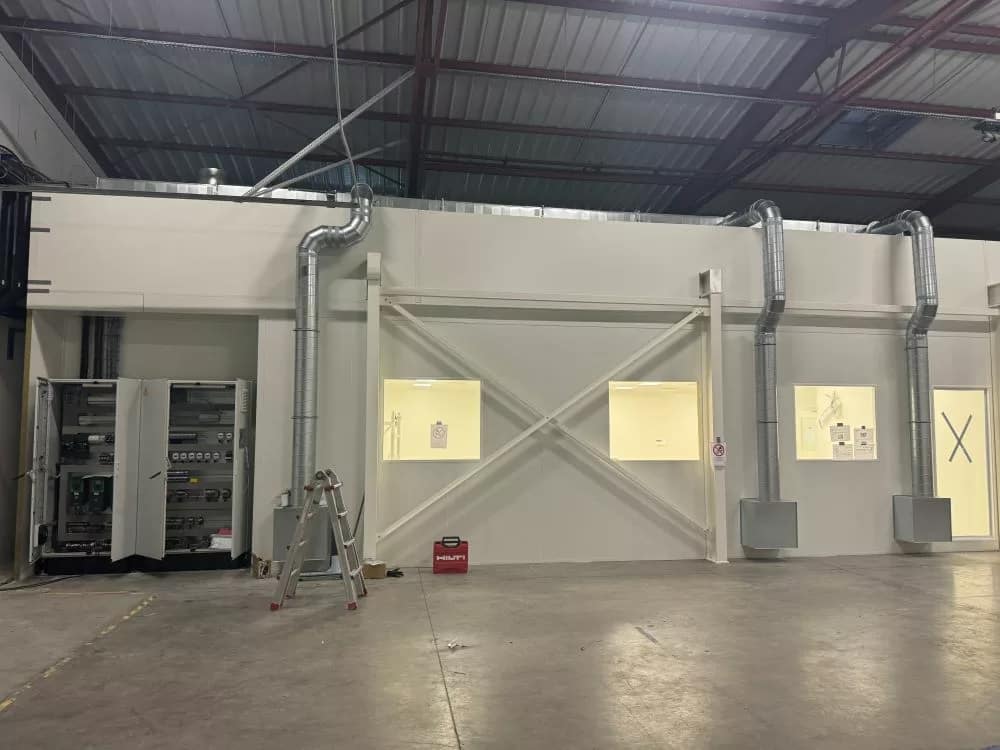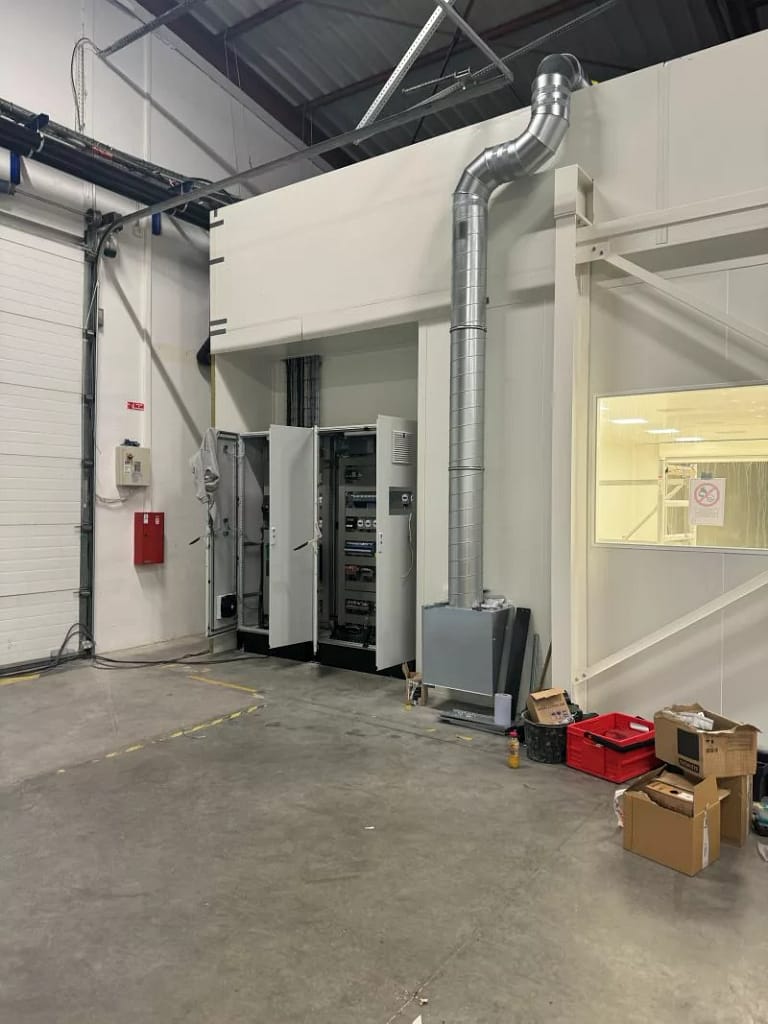 OplusR a pris en charge l’ensemble des travaux : montage de la charpente métallique, installation des panneaux, vitres, portes simples battantes et portes à enroulement. Nous avons également conçu les gaines de ventilation, avec un soufflage au plafond et une reprise au bas des cloisons. Côté technique, nous avons réalisé l’intégralité des installations électriques, ainsi que la programmation sous automate Siemens, avec une connexion 4G pour un suivi à distance optimal.