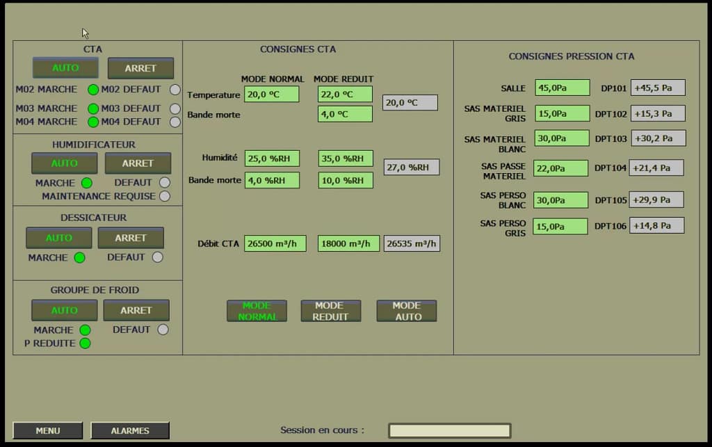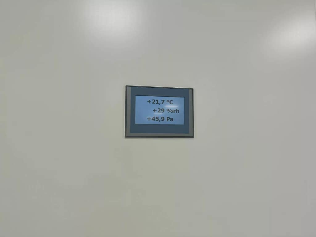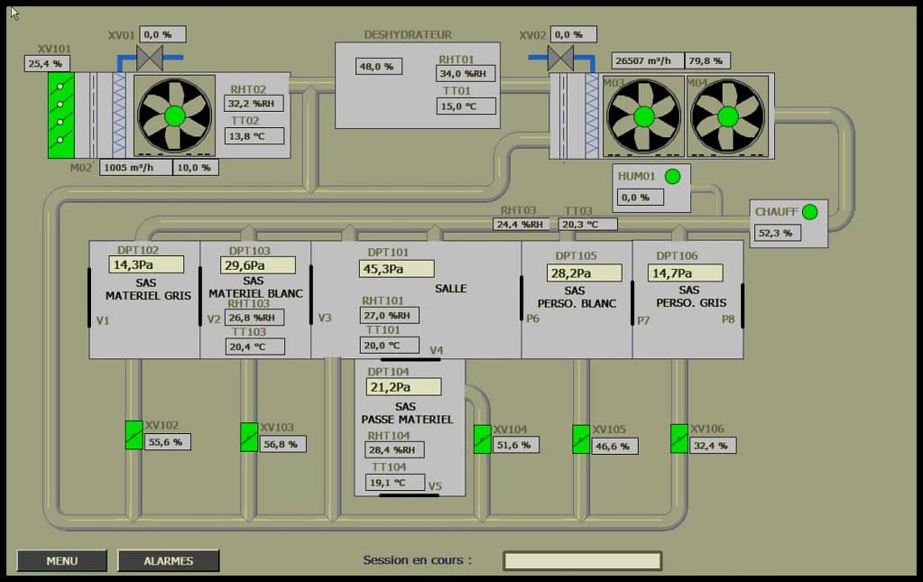 Afin d’assurer une circulation d’air constante et une pression stable, la salle blanche est équipée d’une centrale de traitement d’air capable de traiter 25 000 m³/h d’air. Pour garantir la surpression des salles, une autre centrale de 1 500 m³/h a été installée. La pression interne de la salle est maintenue à +45 pascals par rapport à l’ambiance. De plus, un dessicateur a été mis en place pour abaisser l’humidité et la maintenir entre 20 et 30 % à une température de 20°C.