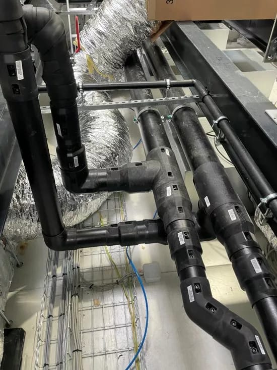 Le système de climatisation et de déshumidification a été confié à un groupe Carrier de 140 kW, placé à l’extérieur sur une dalle en béton. Le choix de ce groupe garantit un contrôle optimal de la température et de l’humidité dans la salle blanche. Les tuyauteries de ce système ont été réalisées en Coolfit PEHD 2.0, un matériau particulièrement adapté aux installations de grande envergure dans des environnements sensibles. Le Coolfit PEHD 2.0 présente de nombreux avantages : une grande résistance mécanique, une installation facile grâce à ses raccords à froid, et une excellente résistance aux agents chimiques. Ce choix permet de garantir une longévité et une efficacité accrues, tout en réduisant les coûts d’entretien.