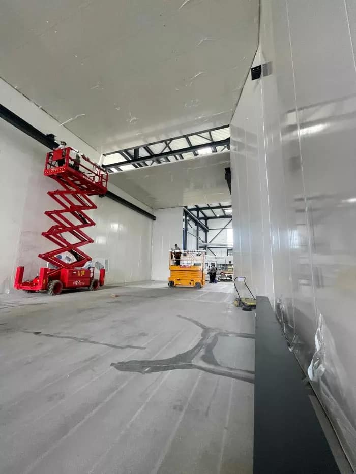 Le chantier a été réalisé dans un hall existant, avec une contrainte majeure : un pont roulant passait au-dessus de l’emplacement prévu pour la salle blanche. Cette contrainte a nécessité une planification minutieuse pour garantir que la hauteur de la salle blanche soit à moins de 150 mm du bas du pont roulant, permettant son fonctionnement sans gêne.