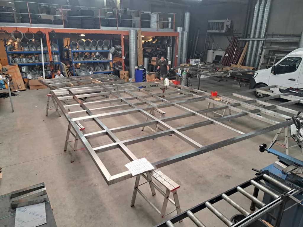 La tente installée par nos équipes est un modèle de 8 x 8 mètres, intégrant une structure en acier inoxydable 304 brossé et équipée de 12 unités de filtration autonomes (voir tarif de nos FFU). Chaque module associe un préfiltre G4 et une filtration ULPA 15, garantissant un flux d’air ultra pur.
