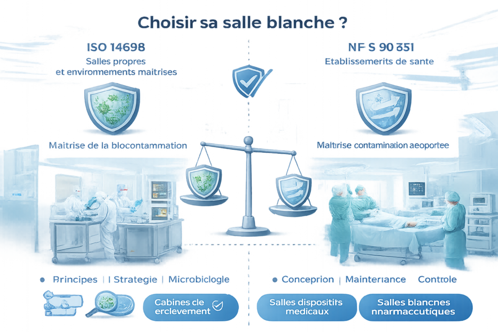 Dans le pharmaceutique, « choisir sa salle blanche » ne consiste pas seulement à définir une classe de propreté : il s’agit surtout d’adapter la maîtrise de la contamination (particulaire et microbiologique) au risque produit et au process. Deux référentiels reviennent souvent et ne couvrent pas les mêmes besoins.