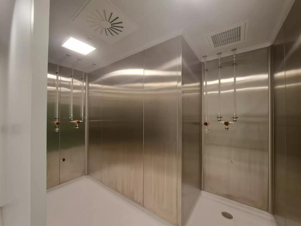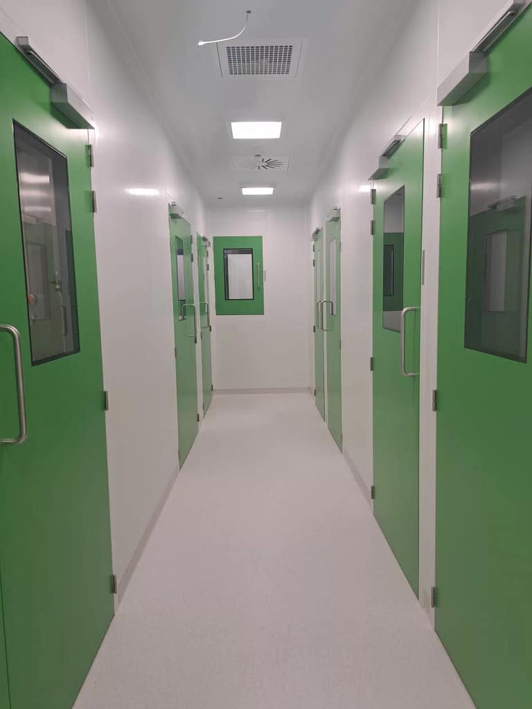 - Zones de préparation et de décontamination : Des zones de décontamination comme des vestiaires, des douches à air, des douches de lavage des mains et des zones de stockage pour les vêtements spéciaux sont souvent intégrées pour éviter d’introduire des contaminants.