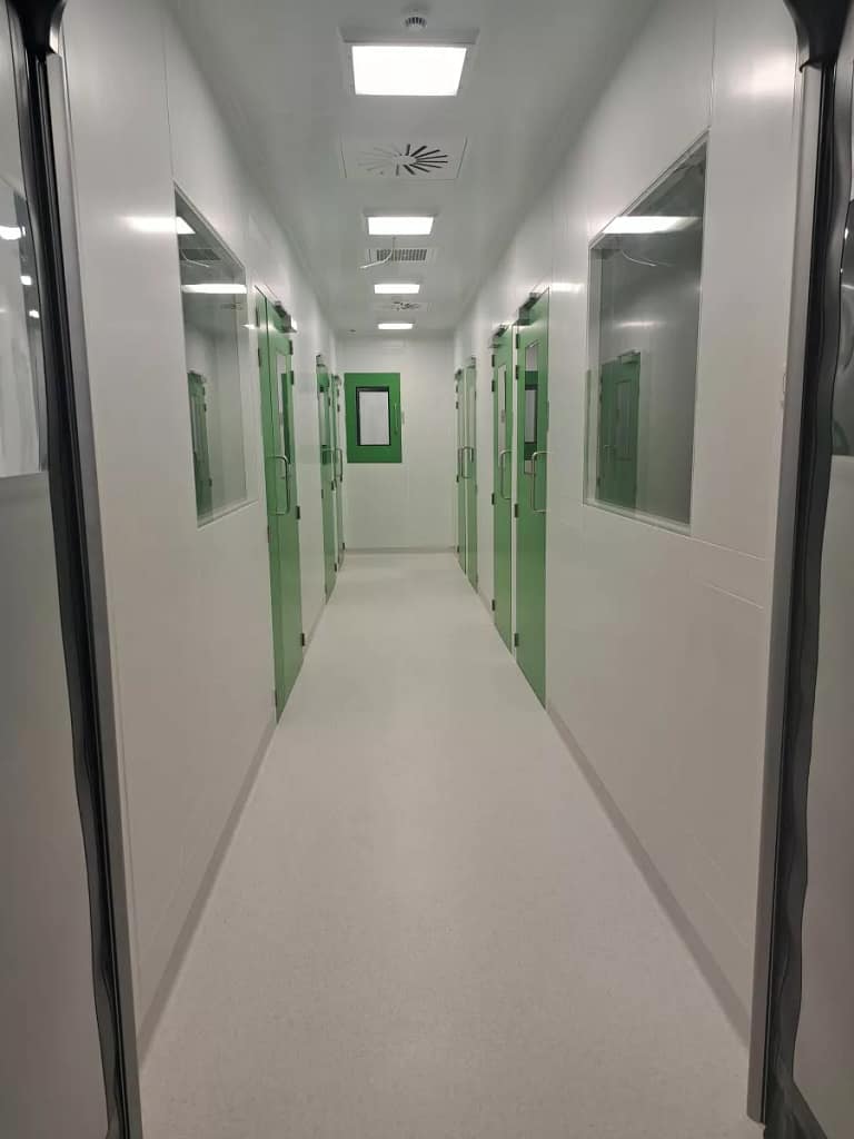 - Matériaux lisses et non poreux : Les murs, les sols et les plafonds doivent être fabriqués à partir de matériaux lisses, non poreux et faciles à nettoyer pour éviter l’accumulation de particules. Par exemple, les matériaux courants sont le métal, l’acier inoxydable, les plastiques anti-bactériens, et les panneaux de particules recouverts de résine époxy.