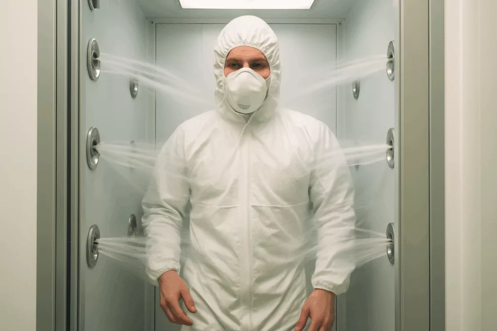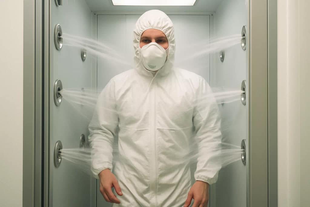 Une douche à air, utilisé avant d’entrer dans une salle blanche, est un dispositif conçu pour réduire la contamination par les particules, les poussières et autres contaminants avant qu’une personne n’entre dans un environnement contrôlé. Les douches à air font partie d’un système de décontamination, et leur rôle est essentiel pour maintenir la propreté et la stérilité des salles blanches, qui sont des espaces où l’air est filtré et où les niveaux de contamination doivent être minimisés à tout prix. Voici comment elles fonctionnent et leur principe :
