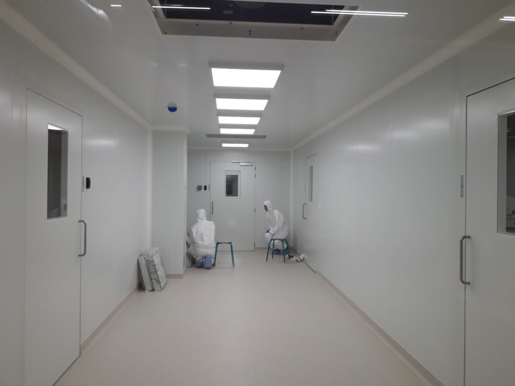 La salle propre ISO 7/8 est construite à l’aide de panneaux sandwich type pharma light, l’isolant est du PIR avec un classement au feu M1, les cloisons font 60 mm d’épaisseur et les plafonds 80 mm. Une offre peut aussi être faite pour des panneaux de laine de roche, classement au feu M0. L’ossature du plafond est auto portante et permet à un homme seul de se déplacer au-dessus du faux plafond.